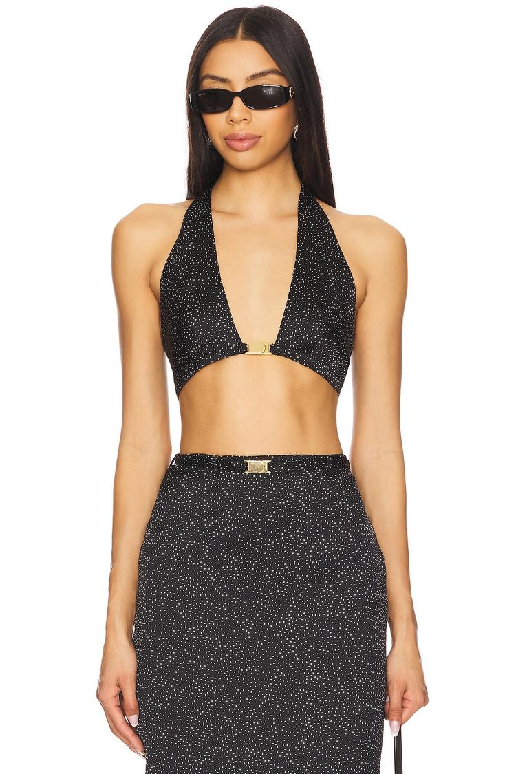 A sleek bralette crafted in midweight jersey fabric featuring a classic black base adorned with an all-over white polka dot pattern. The fitted silhouette is enhanced by a halter neck and a front clasp closure, creating a sexy and modern look. Its cropped length and strapless styling make it perfect for warm spring and summer days. Versatile for casual outings, date nights, or beach vacations, this trendy piece adds a bold yet playful touch to your wardrobe.