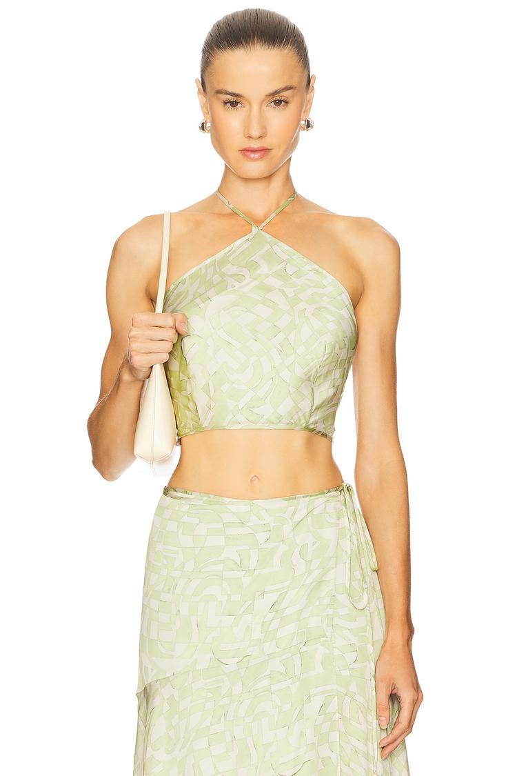 Soft matte light green satin fabric with a subtle abstract all-over pattern shapes this fitted cropped top, featuring a halter neck and delicate spaghetti straps. The back reveals a charming tie-back closure with an additional halterneck tie, adding a sophisticated yet modern touch. Ideal for spring and summer, this chic piece pairs effortlessly with high-waisted skirts or pants, making it perfect for casual outings, brunch dates, or lively night outs. The lightweight viscose fabric ensures comfort and breathability for warm weather occasions.