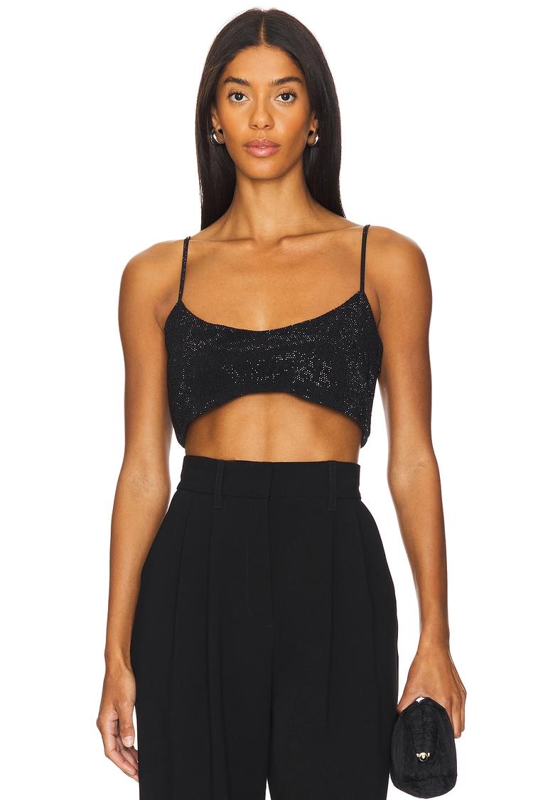 Shimmering with all-over rhinestones, this fitted cropped top features a sleek U-neck and delicate spaghetti straps for a modern, sexy vibe. Crafted from heavyweight polyester with boned sides and a concealed side zipper, it offers structure and ease of wear. The matte black base is elevated by sparkling details, making it ideal for night outs, girls’ nights, and cocktail events. Its sleeveless silhouette and cropped length deliver a bold, confident look perfect for evening occasions.