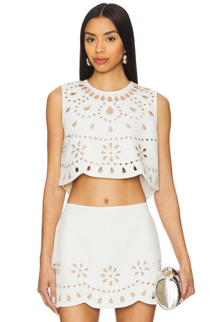 Delicately crafted with midweight crepe fabric, this cropped shell top features a round neckline and sleeveless styling for a fresh spring and summer look. Eyelet cut-outs paired with rhinestone embellishments and a scalloped hem add a sophisticated charm. The hidden back zipper ensures a seamless fit, while the lined design includes a detachable cami for comfort. Perfect for casual outings, brunch dates, or night events, this versatile piece brings understated elegance to your wardrobe.