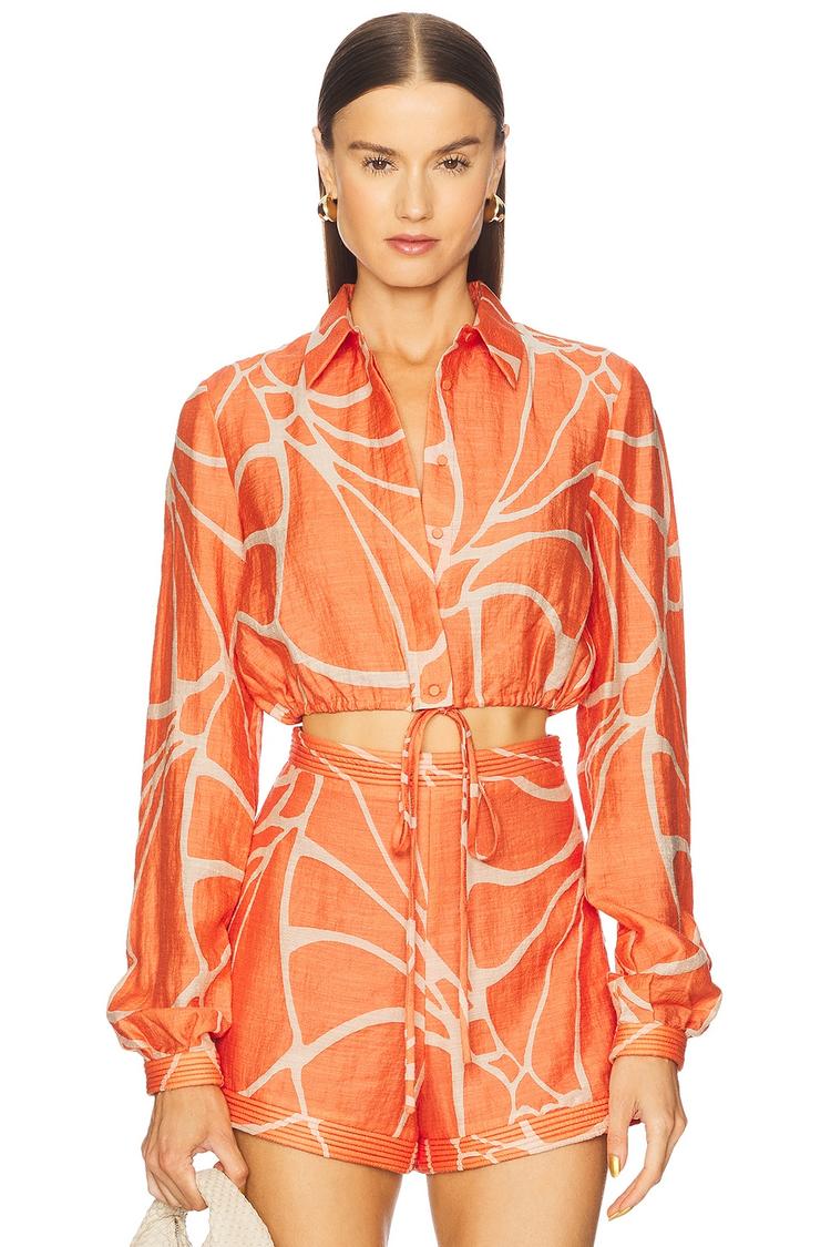 Lightweight organza fabric and a loose blouson silhouette give this waist-length top a breezy, modern appeal. The bright orange and off-white abstract print flows all over the garment, paired with a classic collar and long cuffed sleeves for a polished finish. A front button closure and drawstring hem add subtle functionality and style. Perfect for spring and summer, this chic top suits casual outings, brunches, and night outs with effortless flair.