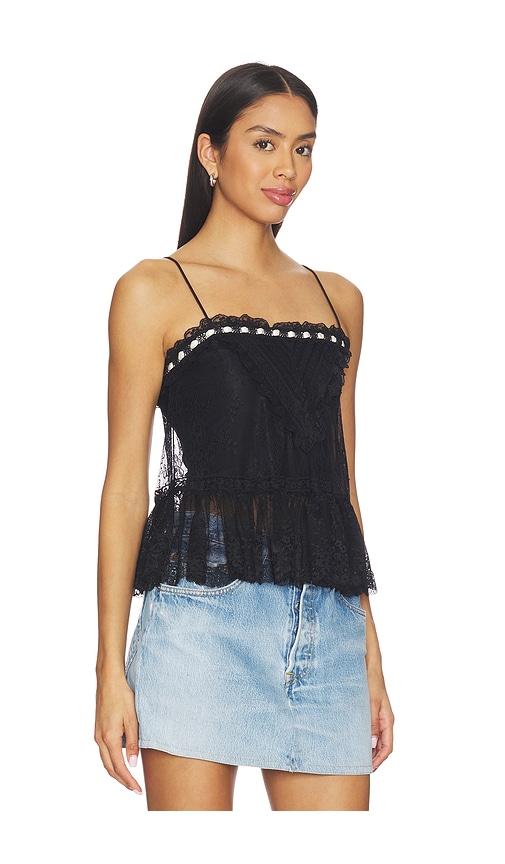 ALICE + OLIVIA ALESSIA LACE RUFFLE CROP TOP IN BLACK.
