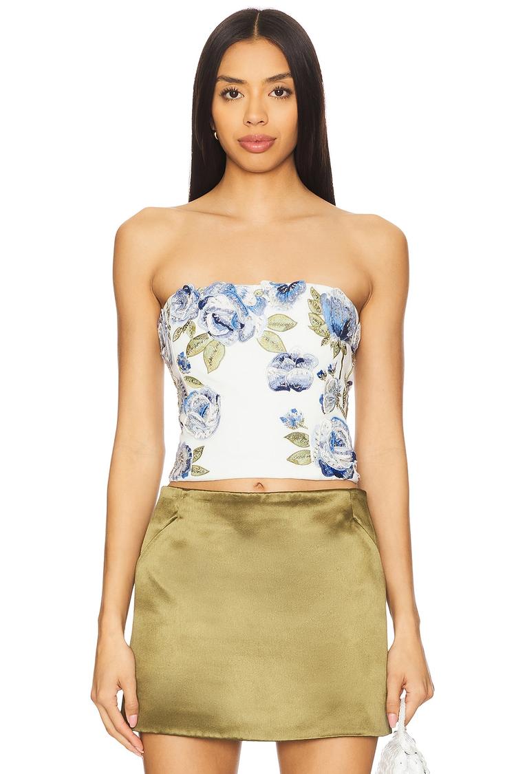 A sleek cropped corset top crafted in midweight crepe blends polyester, viscose, and elastane for a fitted silhouette. The strapless straight neckline and boned bodice enhance the chic, elegant look, while embroidered blue floral accents adorn the white base all over. Perfectly cropped to pair with high-waisted bottoms, this versatile piece suits spring and summer occasions including casual outings, brunches, and romantic date nights. The back zipper closure ensures a smooth fit, making this top a refined choice for stylish, warm-weather ensembles.