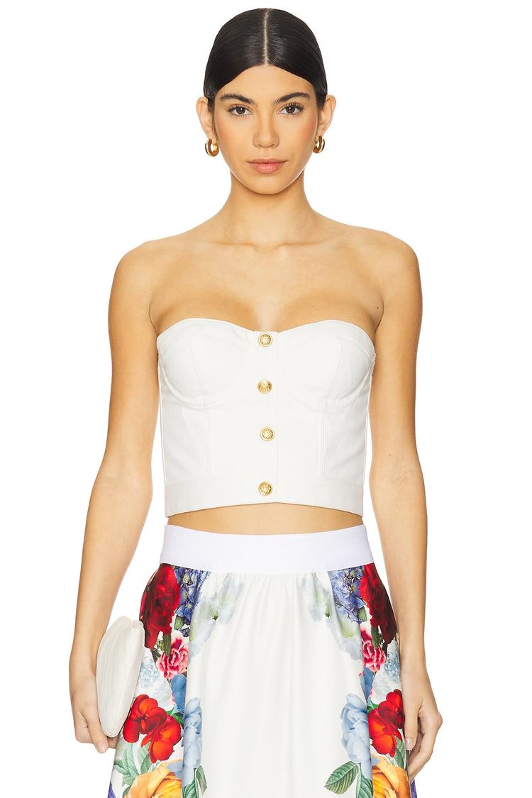 Structured yet effortlessly stylish, this white cropped corset bustier features a boned bodice and a sleek straight neckline. Crafted from a midweight denim cotton blend with a fitted silhouette, the strapless design enhances a modern and sexy vibe. The back zipper closure and faux front button details add refined touches, making it a versatile choice for casual outings, brunches, and date nights during spring and summer. Its clean, solid white tone offers a chic foundation for pairing with floral skirts or bold accessories.