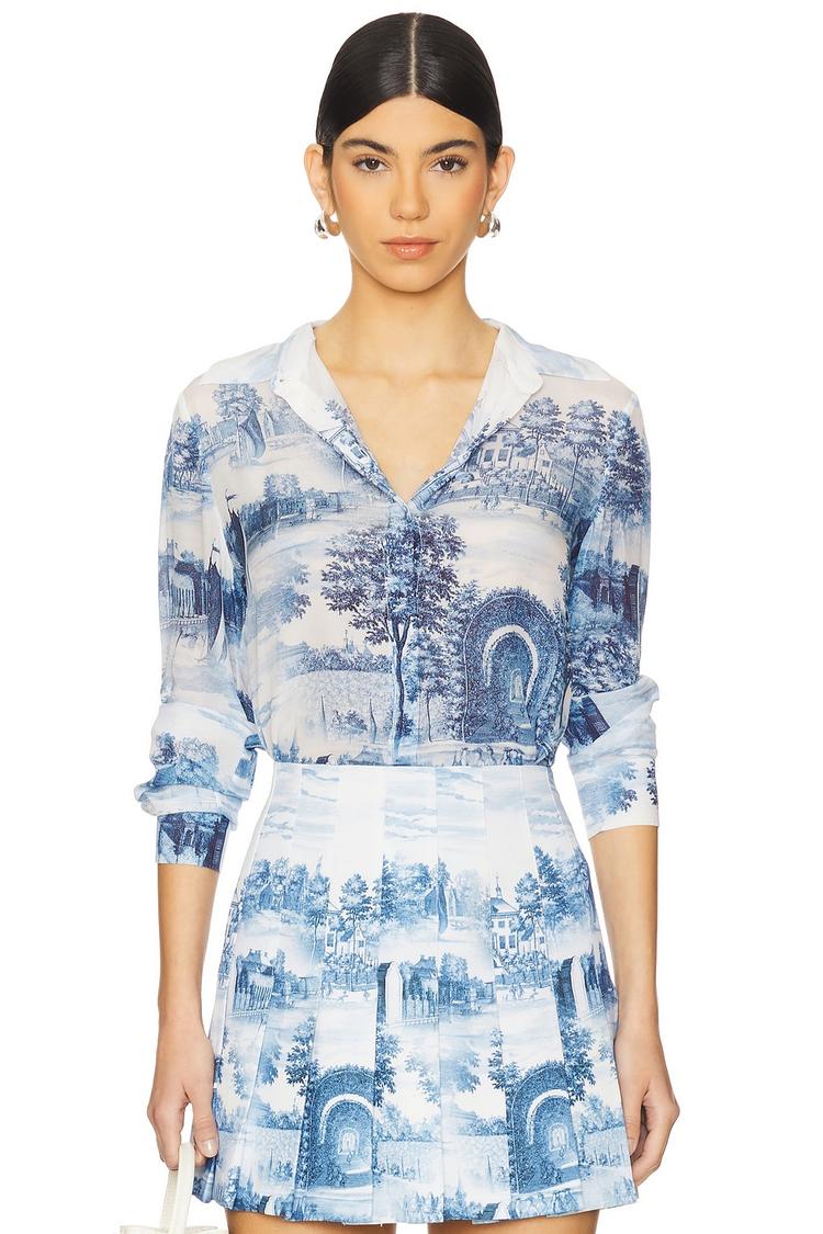 Delicately crafted from lightweight silk chiffon, this elegant blouson top features a classic V-neck and long regular sleeves for a refined silhouette. The hip-length hem and front button closure enhance its relaxed fit, while the all-over novelty print in dark blue on a white base adds a sophisticated artistic touch. Perfect for spring, summer, and autumn days, it transitions seamlessly from casual brunches to polished workwear settings. The sheer fabric offers a subtle allure, making it a standout piece for versatile styling occasions.