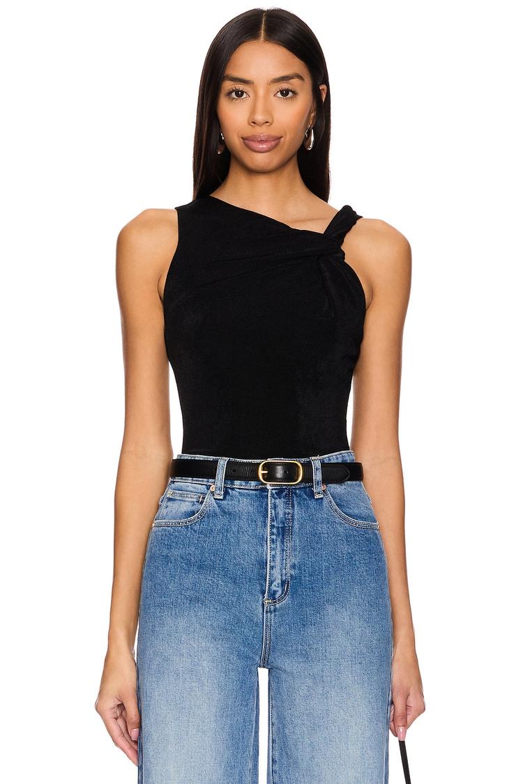An elegant fitted tank top featuring an asymmetric neckline with a knot detail at the shoulder. Crafted from midweight polyester jersey, this waist-length sleeveless piece offers a sleek, minimalist silhouette perfect for spring and summer wear. The solid black color enhances its modern, chic vibe, making it ideal for casual outings, brunch dates, or evening occasions. Its slip-on closure ensures effortless styling, while the subtle bow detail at the shoulder adds a refined touch of sophistication.