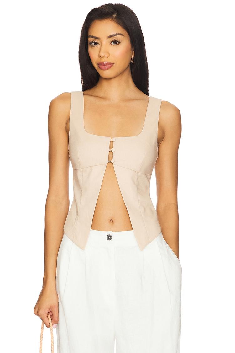Midweight linen blend fabric shapes this fitted corset top with a flattering square neckline and wide straps for added support. The waist-length silhouette features a chic front button closure with loop detail, perfect for layering or wearing solo. Its matte beige tone lends a modern, versatile edge that suits spring and summer occasions alike. Ideal for casual outings, brunch dates, or relaxed evenings, this top pairs effortlessly with high-waisted pants or skirts, offering a contemporary yet timeless appeal.