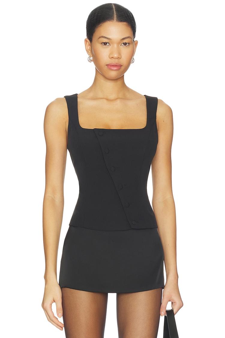 Sleek and modern, this black corset top features a square neckline and asymmetric button-up closure that adds a chic twist to classic tailoring. Crafted from a stretchy polyester-elastane blend, it offers a tapered fit that accentuates the waist and flatters the silhouette. Wide straps and a sleeveless design make it perfect for layering or wearing solo. Ideal for casual days, brunches, and night outs, this waist-length piece blends contemporary style with versatile wearability.