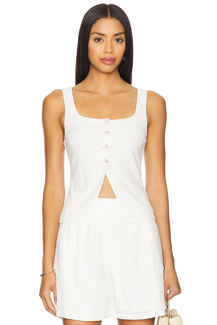 Soft cotton and viscose blend fabric combines with a fitted silhouette in this sleeveless tank top featuring a flattering square neckline and wide straps. Front button closure adds subtle detail to the crisp white fabric, while the waist-length cut makes it ideal for casual spring and summer days. Whether you're dressing for brunch, everyday errands, or relaxed weekend outings, this minimalist chic top offers comfort and effortless style.