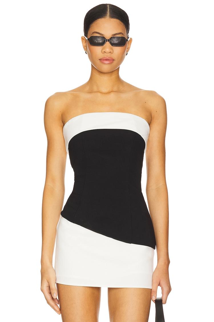 A sleek and modern strapless cropped top featuring a bold color-blocked design in matte black and white crepe fabric. The fitted silhouette contours the body, with a straight neckline and sleeveless styling that highlights the shoulders. An invisible back zipper ensures a clean finish. This versatile piece is perfect for cocktail parties, night outs, or date nights, offering an elegant yet chic vibe with its minimalist contrast detail. Crafted from polyester and elastane blend crepe, it provides both comfort and style for all-weather wear.