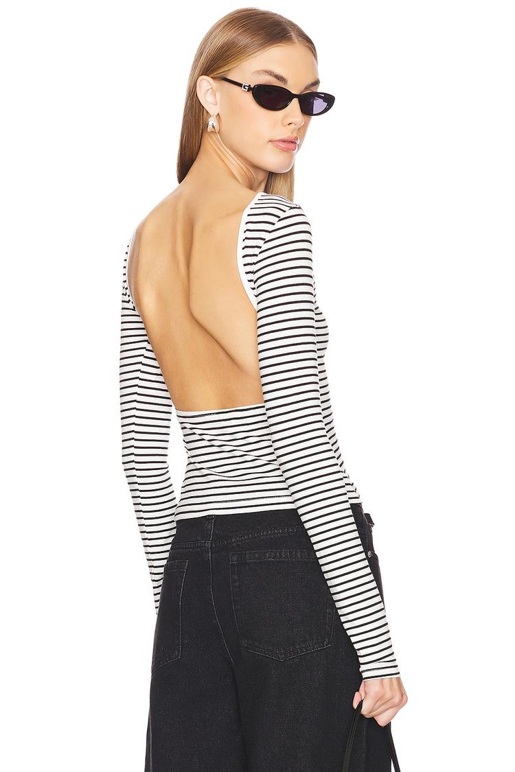 Classic black and white stripes define this cropped top crafted from a lightweight cotton-elastane jersey blend for a soft, comfortable fit. Featuring a fitted silhouette with long regular sleeves and a modest round neckline, its standout element is the daring open back design that adds a modern, chic twist. Ideal for casual outings, brunch dates, or night outs, this minimalist piece balances timeless patterning with contemporary style, making it a versatile addition to your wardrobe all year round.
