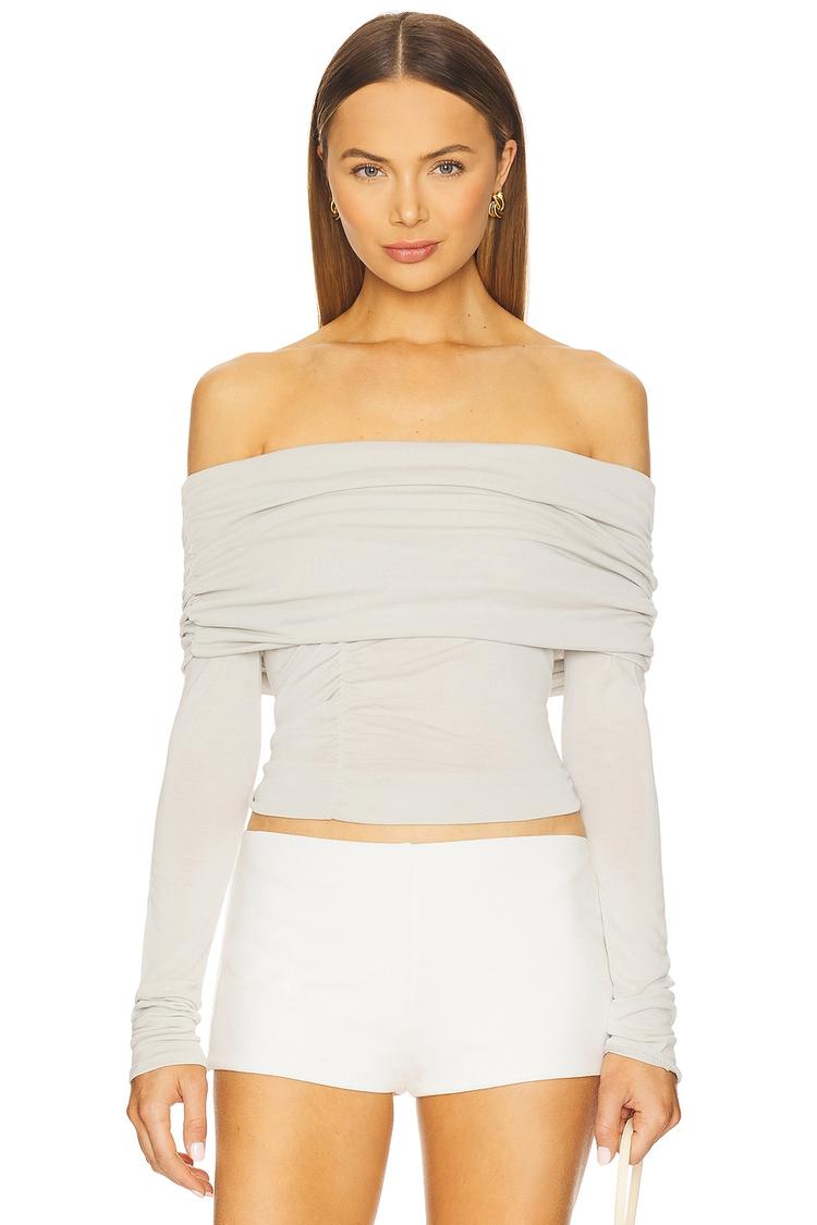 Softly structured with a foldover off-shoulder neckline, this cropped top in off-white offers a sleek, slim fit that highlights ruched bodice details. Crafted from midweight Tencel™ Lyocell jersey, its long regular sleeves and covered back lend a minimalist chic vibe perfect for spring through autumn. Ideal for casual days, brunch dates, or laid-back evenings, this versatile piece blends comfort with refined style for effortless wearability.