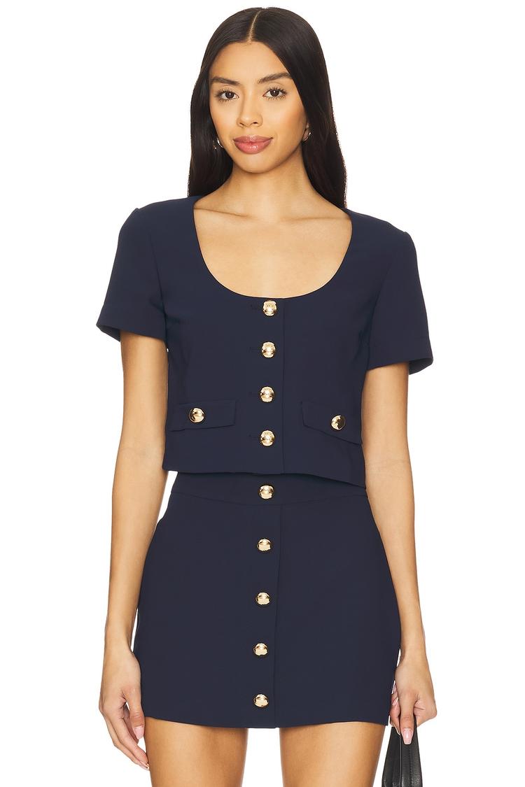 Matte dark blue polyester brings a timeless elegance to this cropped Benton Top featuring a classic round neckline and half-length regular sleeves. The front is adorned with a row of gold-tone buttons adding chic detail and faux pockets for style without bulk. Its regular fit and covered back create a minimalist silhouette perfect for casual outings, workwear, or business casual environments. This versatile piece pairs seamlessly with high-waisted bottoms for brunch dates or relaxed office days, making it a refined staple for all-weather wear.
