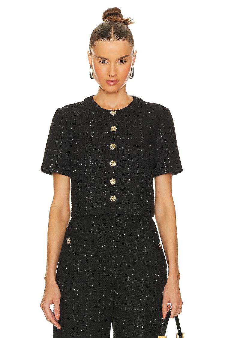 A refined black boxy cropped top crafted from woven polyester tweed with subtle metallic threading that adds a touch of shimmer. Featuring a classic round neck and half-length regular sleeves, it closes with elegant floral-shaped buttons down the front. This versatile piece pairs well with tailored trousers for workwear or elevated casual looks, making it ideal for business casual, brunch dates, or relaxed evenings out. The metallic accents lend a chic and sophisticated finish, perfect for all seasons.