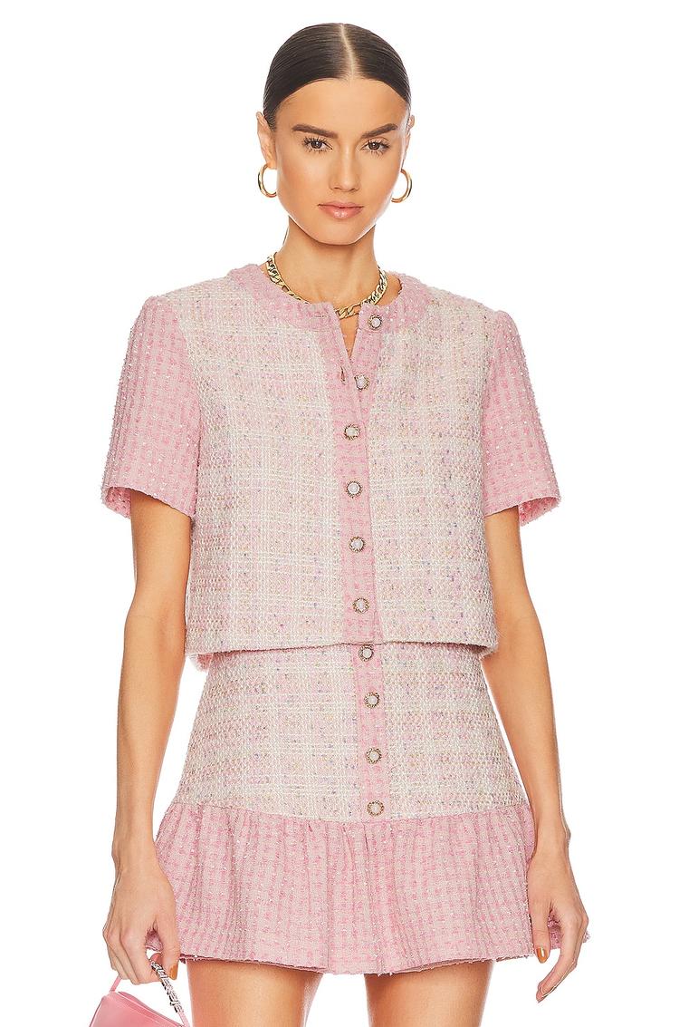Ever so chic in soft pink tweed, this Braswell Top from Amanda Uprichard elevates a casual wardrobe with couture flair. Crafted in polyester tweed, it flaunts a cropped, boxy silhouette, a rounded crew neckline, and short sleeves for a light, wearable layer. The front button closure adds classic polish, while the subtle ruffle at the hem gives a playful, feminine finish. Pair with a matching mini or high-waisted bottoms for a dressy brunch look, or wear with tailored trousers for smart workwear. Effortless, versatile, and distinctly polished for warm-weather days.