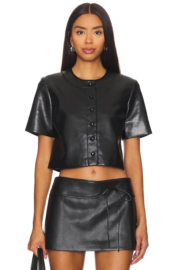 Embrace city-chic confidence with the Braswell Top by Amanda Uprichard. This cropped, lightweight faux-leather piece creates an instant, edgy silhouette with a clean round neck and short sleeves. A front button closure adds subtle vintage polish, while the covered back keeps the look sleek from every angle. Crafted with a polyurethane exterior and a polyester lining for comfort, it pairs perfectly with high-waisted skirts or sleek pants for date nights, nights out, or stylish weekend outings. Effortlessly versatile and fashion-forward, it’s the kind of top that elevates any modern wardrobe.