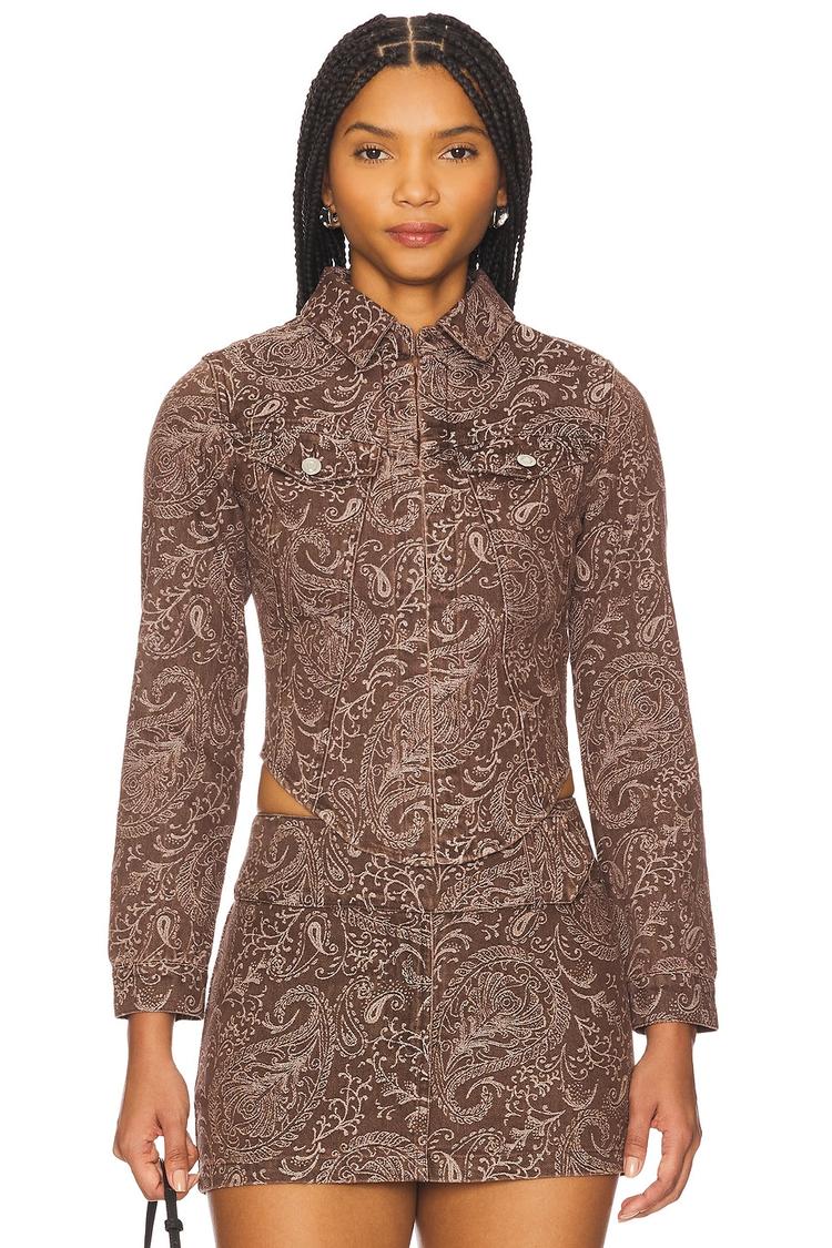 A refined twist on the classic shacket, this Bristol Top features a fitted silhouette and waist-length hem in a midweight twill fabric blending cotton and polyester. The all-over paisley pattern in warm brown and beige tones adds timeless elegance, while long sleeves and a turn-down collar create a polished look. Front hook and bar closure and faux breast pockets enhance its business chic appeal. Ideal for casual outings, workwear, and brunches, this versatile piece brings autumnal charm and modern sophistication to your everyday wardrobe.