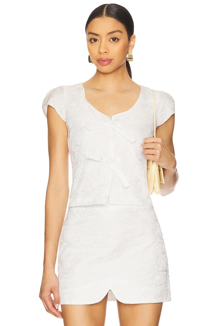 Delicate jacquard texture and a fitted silhouette define the Bryant Top, featuring a flattering V-neck and charming cap sleeves. The cropped length and dual front tie closures add a stylish touch, perfect for spring and summer days. Its classic white hue and elegant bow details make it a versatile choice for casual outings, brunches, and date nights. Crafted from a comfortable polyester-elastane blend, this top balances sophistication with ease, ideal for elevating your warm-weather wardrobe with a chic and timeless piece.