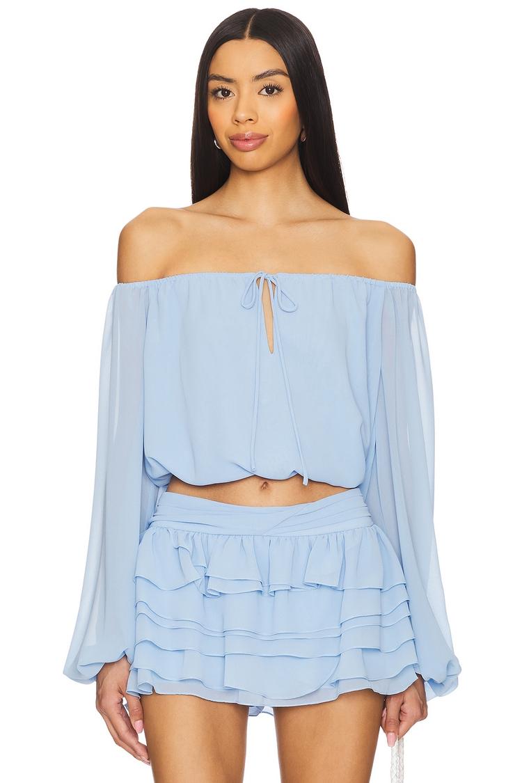 Softly draping in light blue polyester, this off-shoulder shell top features a loose fit with long regular sleeves and a cropped hem adorned with delicate ruffles. The pullover design offers effortless style and comfort, perfect for spring and summer days. Its bohemian and casual chic aesthetic pairs beautifully with vacation getaways, brunch dates, or casual outings. The covered back and subtle front tie add charming details, making this top a versatile addition to your warm-weather wardrobe.