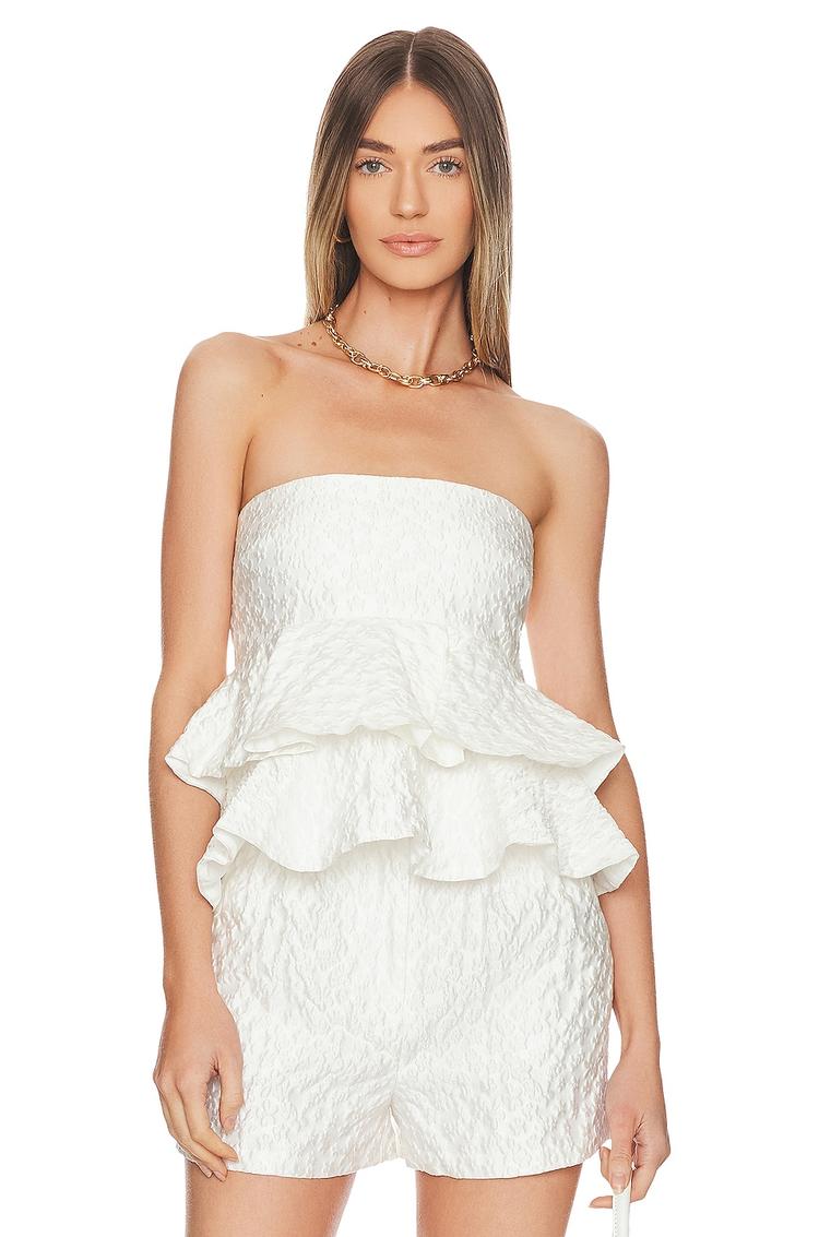 Delicate jacquard cotton fabric shapes this fitted peplum top, featuring a sleek strapless silhouette and a straight neckline. The concealed back zipper ensures a seamless look, while the pleated peplum hem adds a touch of elegant volume. Perfectly suited for spring and summer, this waist-length top is an excellent choice for casual outings, brunch dates, or evening get-togethers. Its classic white hue and sophisticated style make it a versatile piece that effortlessly blends timeless charm with modern chic.