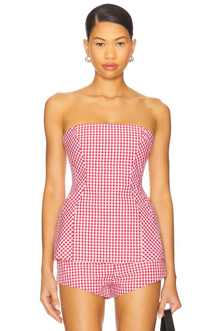 A timeless blend of structure and style, this bandeau peplum top features a classic red and white checkered poplin fabric that embodies a crisp summer vibe. The fitted bodice with boning offers a flattering silhouette, while the strapless straight neckline highlights the shoulders elegantly. Perfect for casual days, brunch dates, or summer outings, its invisible back zipper ensures a sleek finish. Crafted from breathable cotton with a polyester lining, this waist-length piece combines comfort with chic sophistication for versatile seasonal wear.