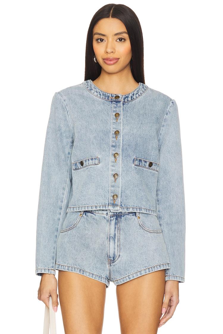 Lightweight denim and a classic round neckline define this hip-length blouson top, tailored with a regular fit for comfortable everyday wear. Long regular sleeves and a front button closure add to its versatile, casual chic appeal. Perfect for casual outings, streetwear looks, and everyday wear during spring, summer, and autumn seasons, this piece pairs effortlessly with matching shorts or jeans for a coordinated denim look.