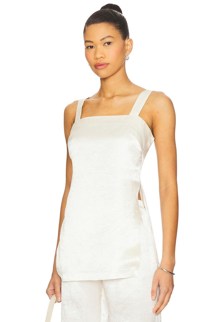 Crisp matte white crinkle satin fabric and a slim fit define this chic tank top with a square neckline and wide straps. Featuring a hip-length silhouette and subtle side slits, this piece offers elegant minimalism perfect for casual outings, brunch dates, or evening affairs. The hidden back zipper closure ensures a seamless look, while the midweight satin fabric adds a touch of refined texture. Ideal for spring and summer wardrobes, this versatile top blends comfort and sophistication effortlessly.