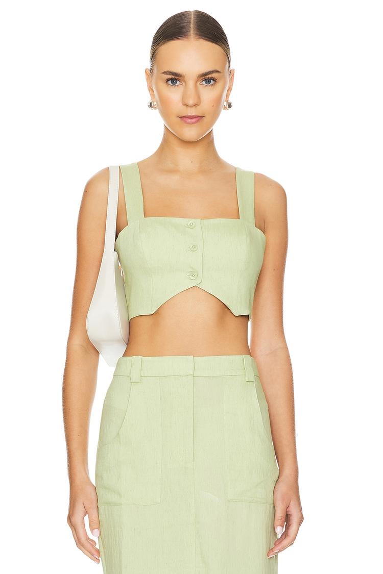 Soft, lightweight linen blend fabric and a fitted silhouette define this Royston Cropped top in a fresh light green hue. The square neckline and wide strap sleeve styling create a clean, minimalist look, while the front button closure adds subtle detailing. Its cropped length paired with a covered back offers a flattering and modern appeal. Ideal for spring and summer, this versatile piece is perfect for casual outings, weekend brunches, or vacation days, delivering both comfort and effortless style.