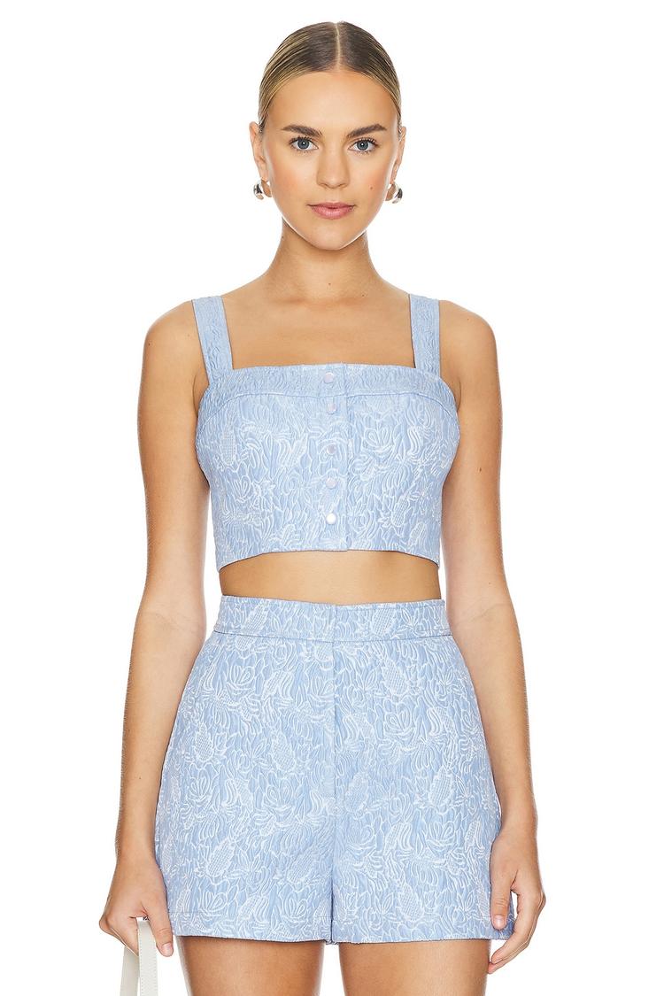 Soft polyester fabric and a fitted silhouette define this cropped top featuring a chic square neckline and wide straps for a modern look. The light blue base with an all-over white floral pattern adds a fresh, summery vibe, complemented by an exposed back zipper closure. Its sleeveless design and cropped length make it perfect for warm weather outings. Ideal for casual days, brunch dates, or vacation adventures, this Amanda Uprichard Spade Top combines style and comfort effortlessly.
