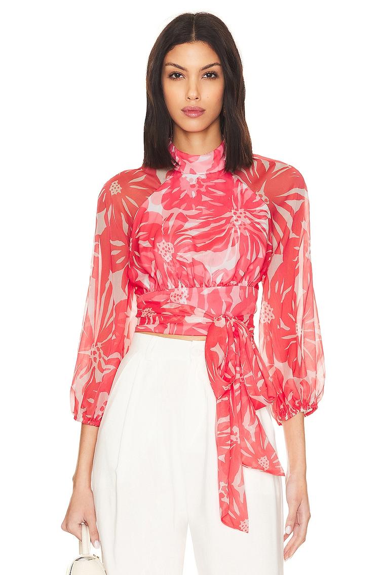 Lightweight chiffon in a coral floral print defines this cropped wrap top, featuring a chic mock neck and romantic blouson long sleeves with elastic cuffs. The relaxed fit complements the dramatic open back with a subtle hook closure, while the wrap tie detail adds a flattering silhouette. Ideal for spring and summer, this versatile piece transitions effortlessly from casual brunches to date nights and lively evenings out, offering a modern yet feminine aesthetic.