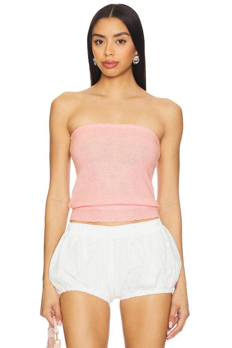 Soft ribbed knit and a fitted silhouette define this strapless tube top in a delicate dusty pink hue. Its scalloped hem adds a subtle feminine touch while the non-slip silicone neckline ensures a secure and comfortable fit. Crafted from a midweight blend of acrylic, nylon, and wool, this waist-length top is perfect for casual brunches, relaxed vacations, or everyday spring and summer wear. The minimalist design paired with cozy fabric makes it an easy choice for effortless chic styling.