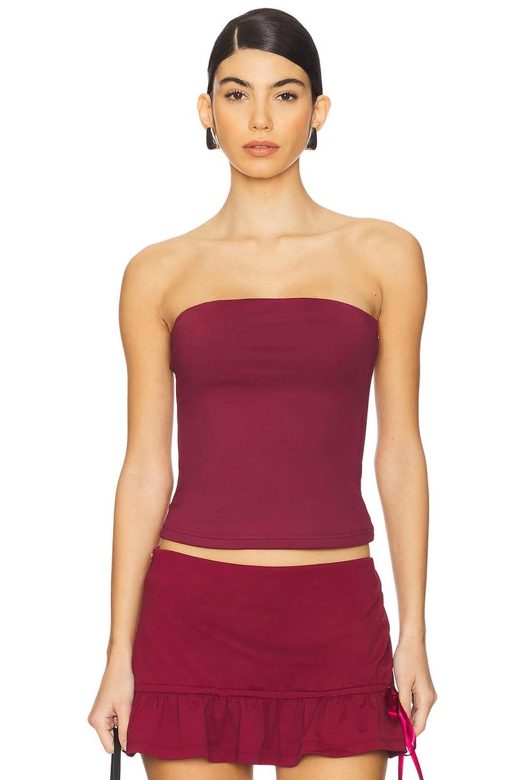 Sleek and fitted, this strapless tube top in matte burgundy offers a smooth jersey fabric that contours the silhouette perfectly. Featuring a concealed side zipper, it ensures a seamless look with a waist-length cut that pairs effortlessly for casual outings, night outs, or brunch dates. The minimalistic design emphasizes the neckline and shoulders, capturing a sexy yet trendy vibe ideal for spring and summer seasons.