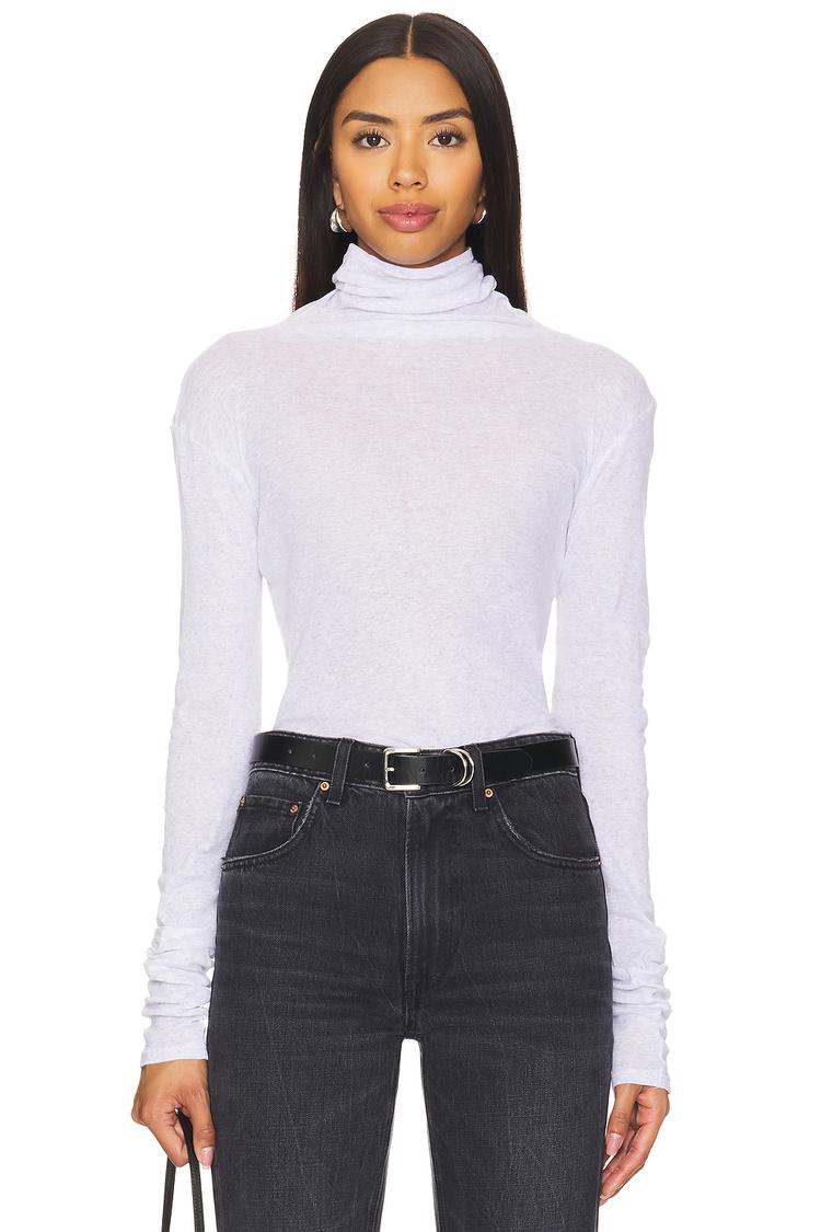 Effortless in crisp white, this lightweight cotton jersey turtleneck hugs the body in a sleek, fitted silhouette. The pull-on top features a classic turtle neck and full-length sleeves, delivering a polished look that works from casual days to weekend outings. The semi-sheer weave adds a whisper of translucence, ideal for layering with a bralette or camisole as shown. Wear it tucked into jeans for a refined, minimalist vibe or styled with a blazer for smart-casual evenings. A versatile staple that elevates any wardrobe with clean lines and timeless texture.