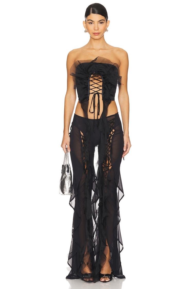 Draping tulle overlays a sleek matte black corset crafted from a luxurious blend of viscose and silk. Featuring a straight, strapless neckline and a fitted silhouette, this cropped top is enhanced with lace-up details at both front and back, secured with a hidden side zipper and tie-back closure. Perfect for sultry summer nights, cocktail events, or a girls' night out, its chic and sexy design elevates any evening ensemble with elegant texture and modern appeal.