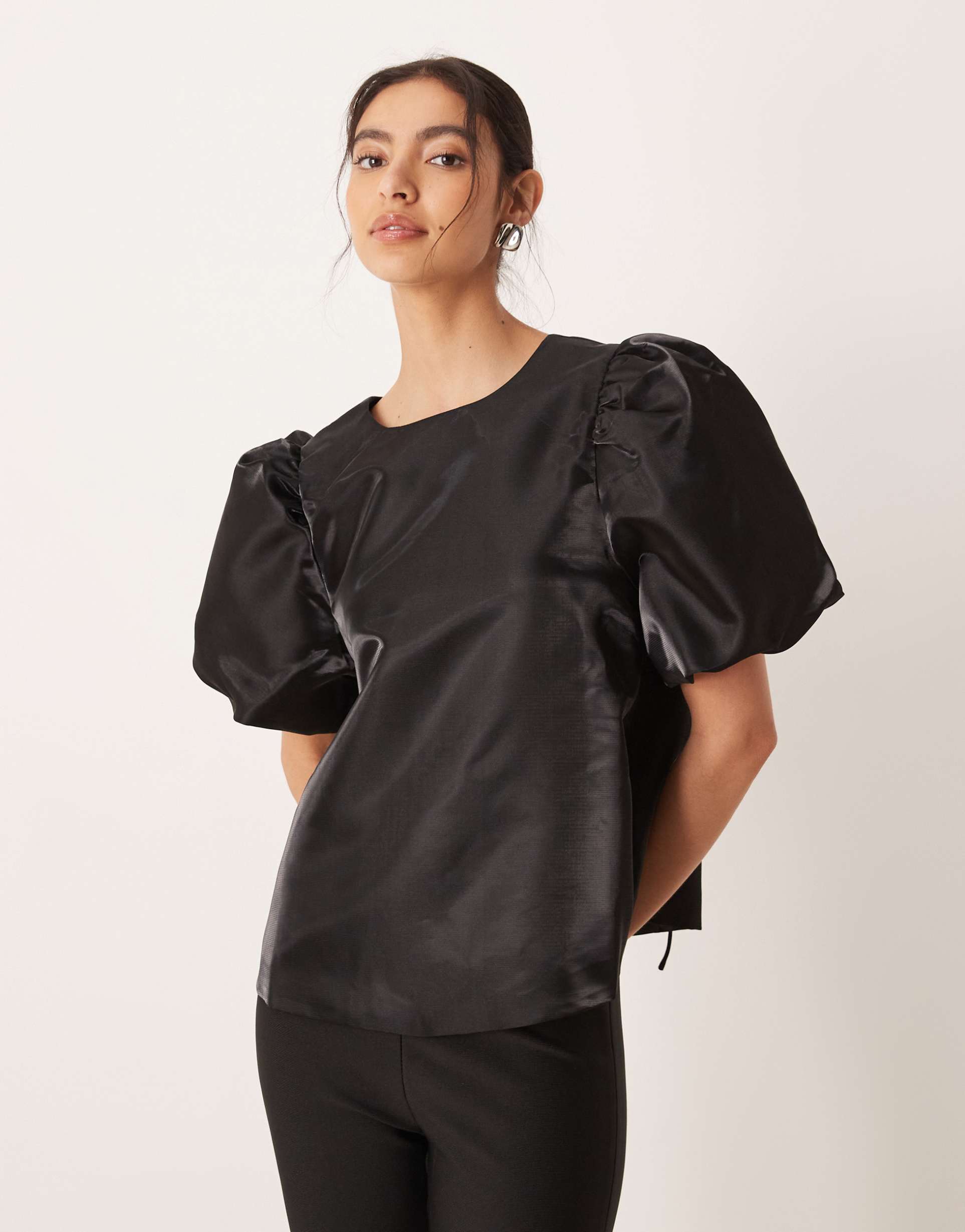Crisp polyester taffeta with a smooth sheen defines this smock top featuring a classic round neck and voluminous puffed half sleeves. The regular fit and hip length silhouette provide effortless comfort and style, while a multiway tie-back closure adds a versatile finishing touch. Ideal for casual outings, workwear, or brunch dates, this elegant and modern top elevates your wardrobe with its structured yet soft drape and subtle shine.