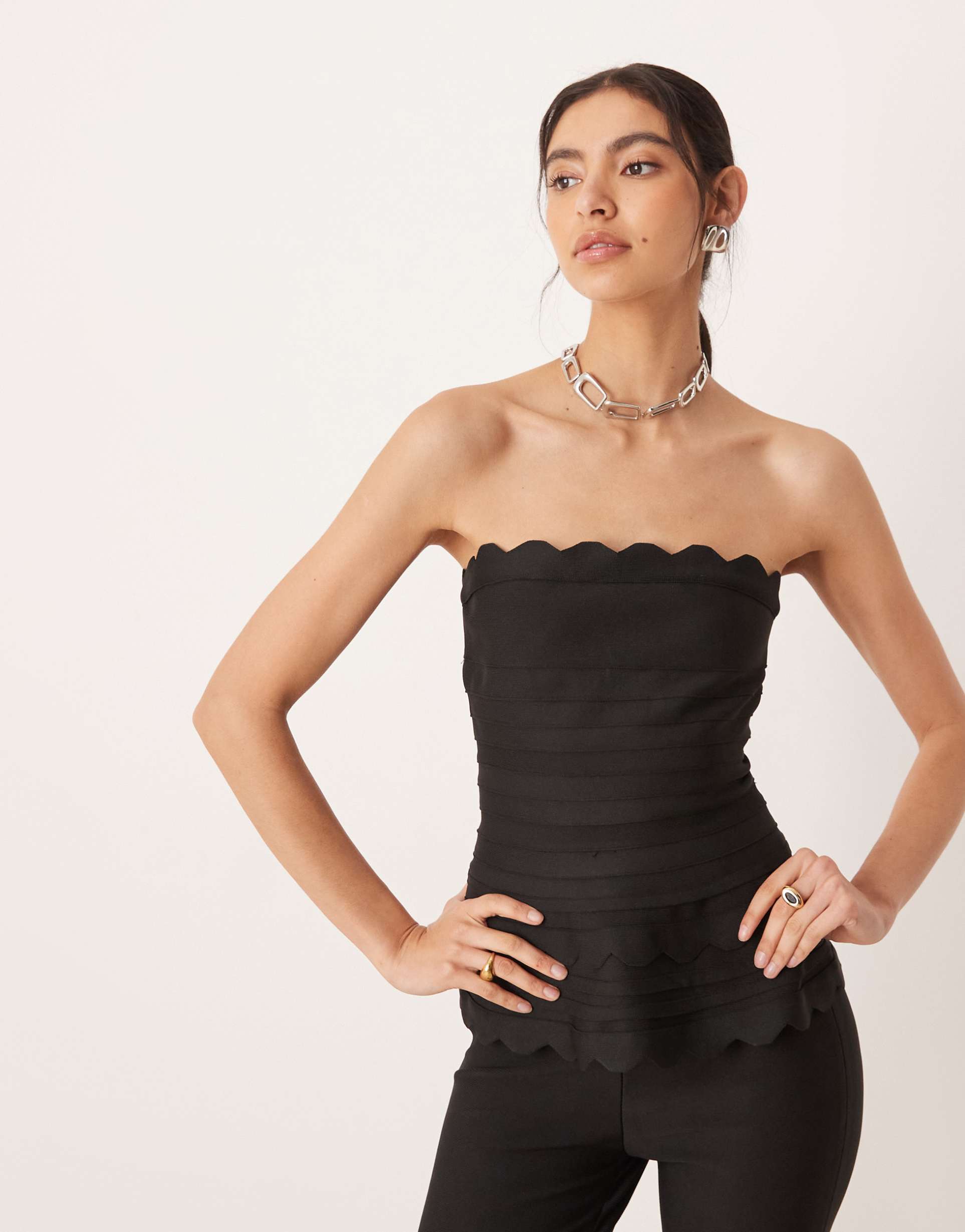 A sleek black bandeau top crafted from structured, stretchy bandage fabric creates a slim and flattering silhouette. Featuring a scalloped hemline and straight neckline, this sleeveless cropped piece closes with a discreet back zipper for a smooth finish. Its modern, chic style makes it perfect for casual outings, date nights, or a night out with friends. Ideal for spring and summer, this versatile top combines comfort and edge effortlessly for a confident, stylish look.