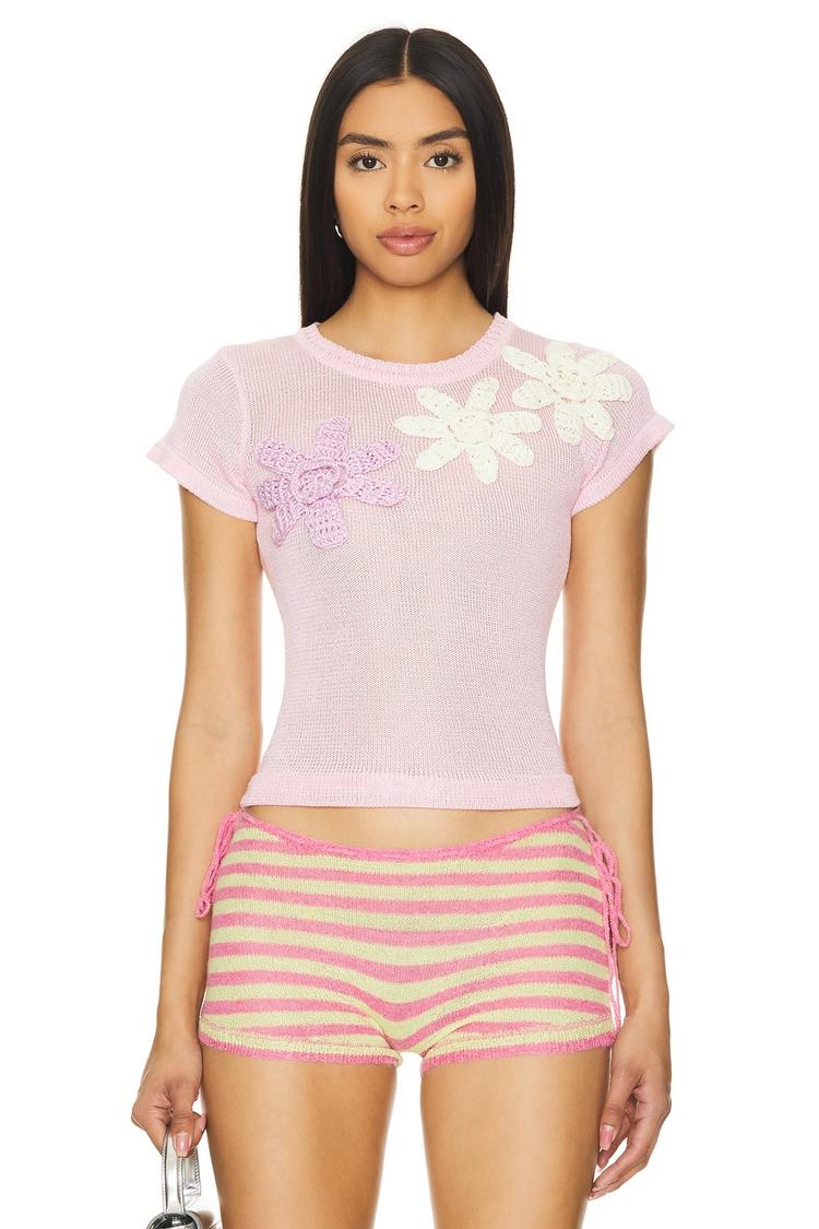 Soft pink knit fabric with delicate crochet and embroidered floral details on the front bodice creates a charming casual chic shell. This fitted, waist-length top features cap sleeves and a classic round neckline, perfect for spring and summer days. The lightweight knit blend of cotton and nylon offers breathable comfort for loungewear, casual outings, or everyday wear. Its pullover design and covered back add simplicity and ease, making it a versatile addition to any relaxed wardrobe.
