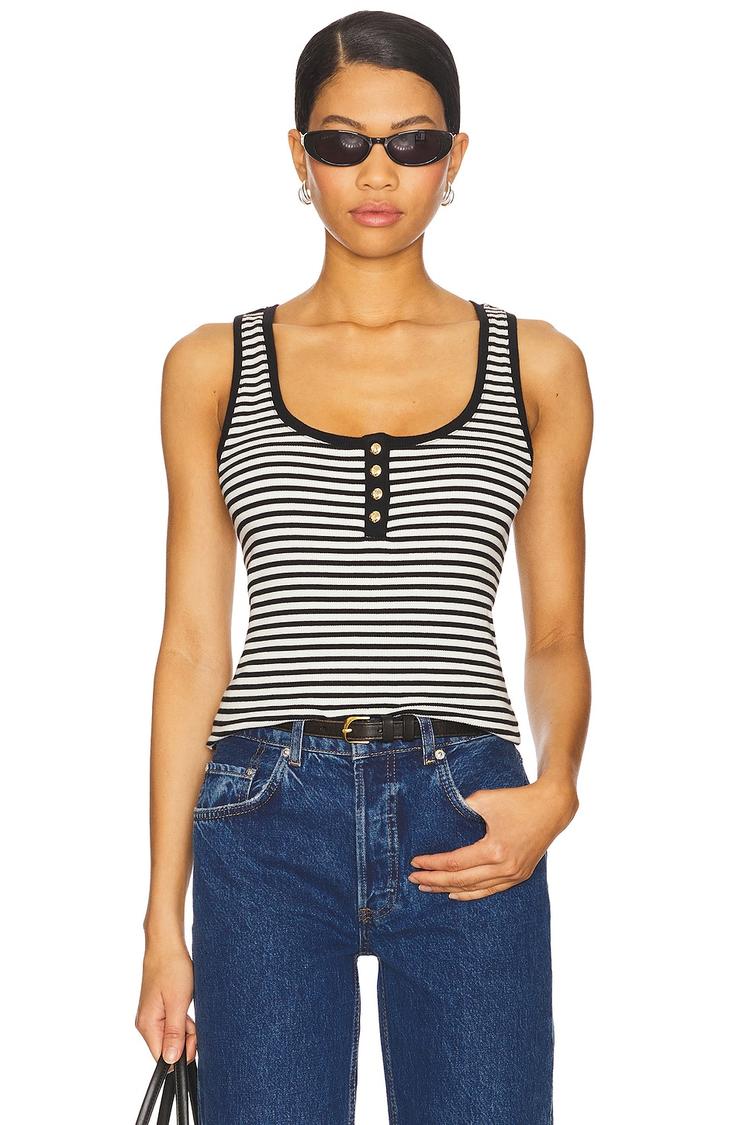 Classic black and white stripes meet a fitted silhouette in this Alessia Tank crafted from midweight cotton-elastane jersey. The sleeveless design features wide straps and a flattering U-neckline with a gold-tone snap button placket at the front, adding subtle detail to the hip-length hem. Its breathable fabric and timeless style make it ideal for casual everyday wear, brunch dates, or travel adventures, offering comfort and chic versatility throughout spring and summer seasons.