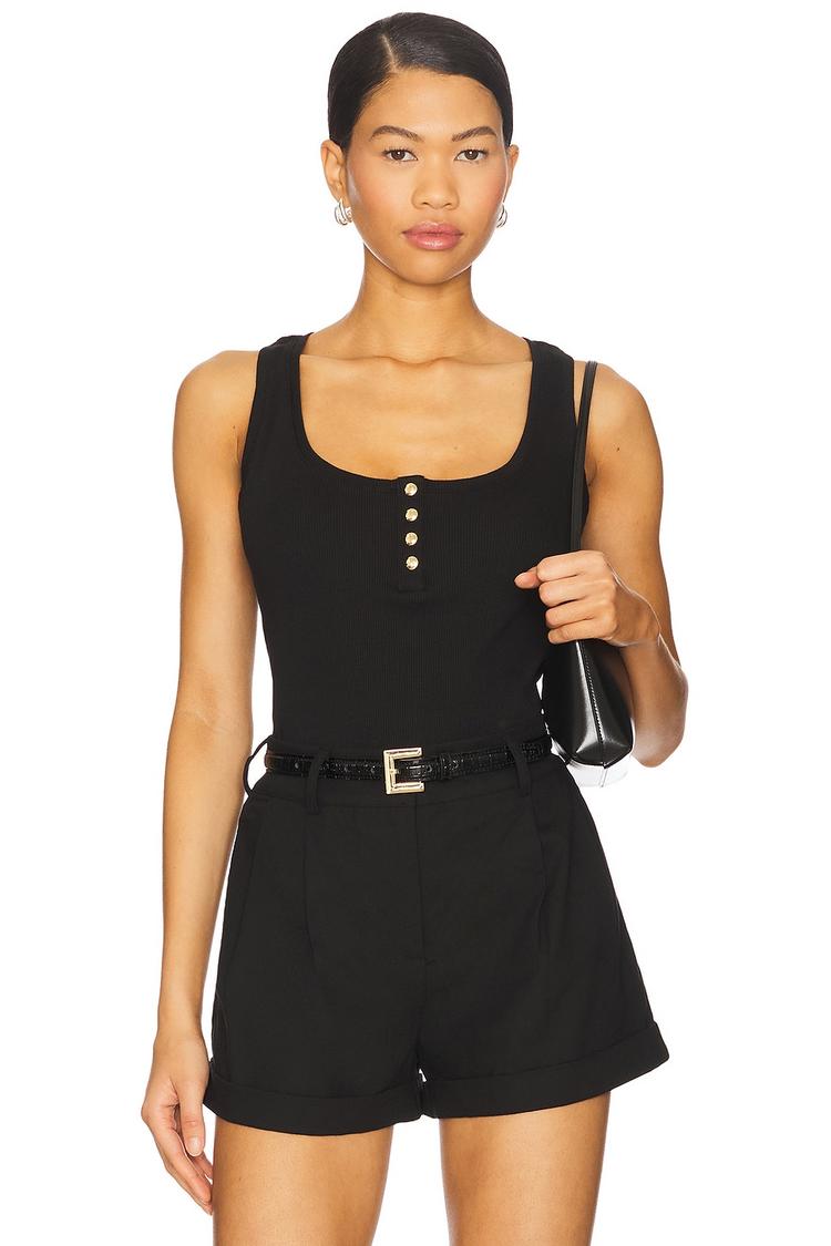 Crafted from a midweight cotton-elastane blend, this slim-fitting Alessia Tank offers a sleek silhouette with a classic U-neck and wide straps. Its solid black hue and gold-tone partial snap button placket add subtle elegance, making it perfect for casual outings, everyday wear, or a relaxed brunch. The sleeveless, hip-length design ensures comfort and versatility across seasons, embodying a minimalist yet chic style that pairs effortlessly with shorts or skirts for an easy, polished look.