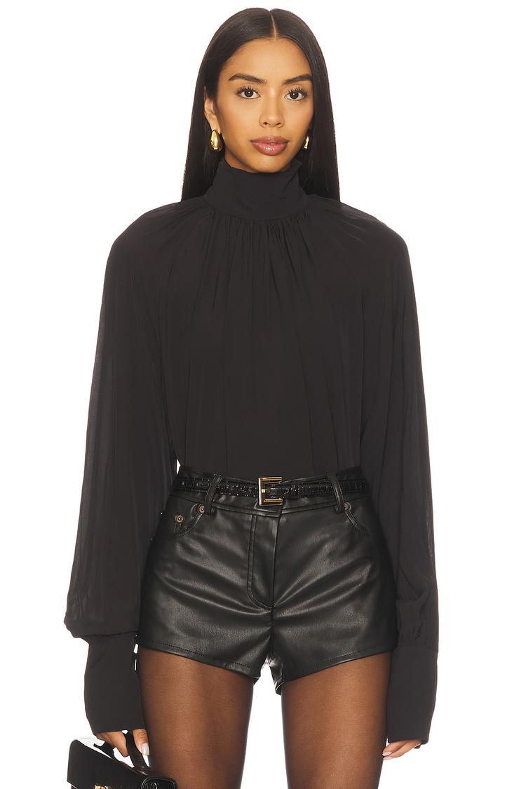 Lightweight matte black viscose georgette flows in a loose blouson silhouette with long cuffed sleeves and a chic mock neck. The hip-length top features a subtle keyhole back closure for a modern touch. Its sheer fabric adds an airy, elegant vibe ideal for casual days, workwear, and business casual occasions, combining minimalist style with sophisticated comfort.