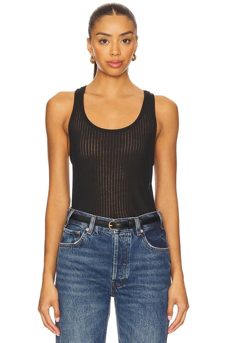 Lightweight ribbed jersey fabric and a slim fit define this black tank top, designed with a classic round neckline and wide straps for easy layering. Its semi-sheer texture adds a subtle allure, making it versatile for casual outings, everyday wear, or travel. The hip-length silhouette pairs effortlessly with jeans or skirts, while polyester-viscose blend ensures comfort and durability across warmer seasons.