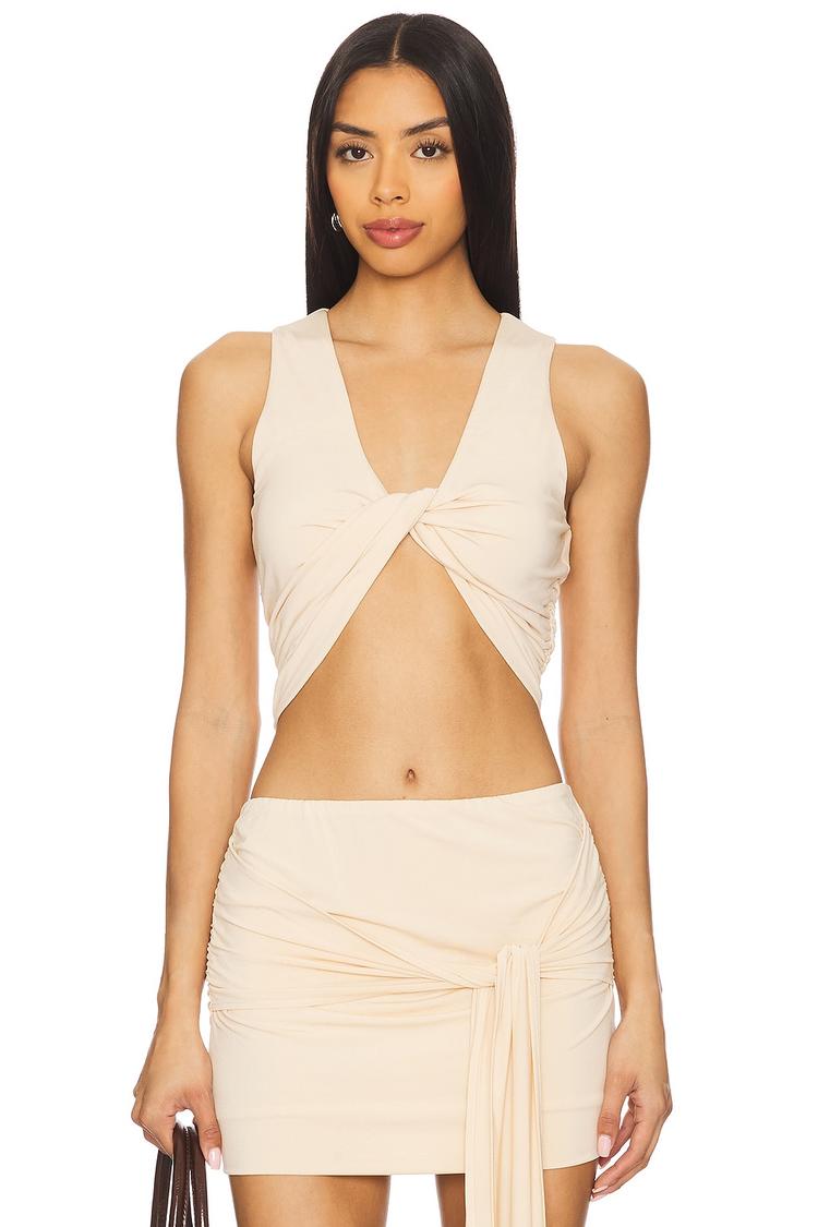 Soft matte beige jersey fabric combines with a fitted cropped silhouette for a chic modern look. Featuring a deep V-neck and wide straps, this sleeveless top is enhanced with a wrap accent and ruched seams at the front bodice, adding texture and visual interest. Its midweight stretch fabric ensures comfort and flattering shape retention. Ideal for casual days, brunches, or night outs, this versatile piece elevates your warm weather wardrobe with a trendy and sexy vibe.