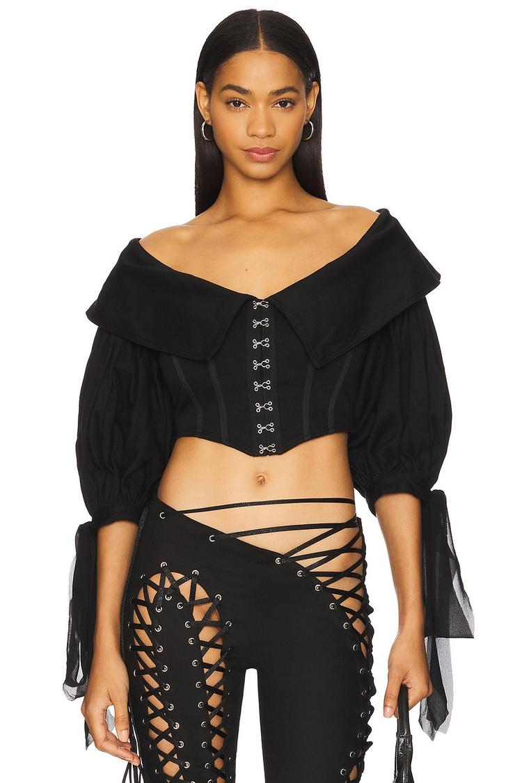 A bold black cropped corset top crafted in midweight twill fabric with a structured boned bodice and a foldover neckline that enhances its edgy appeal. The elbow-length puffed sleeves feature self-tie closures, adding a chic and trendy touch to the fitted silhouette. This versatile piece is perfect for casual outings, night outs, or date nights, offering a confident and fashion-forward look that stands out with its unique design details and comfortable cotton-viscose blend.