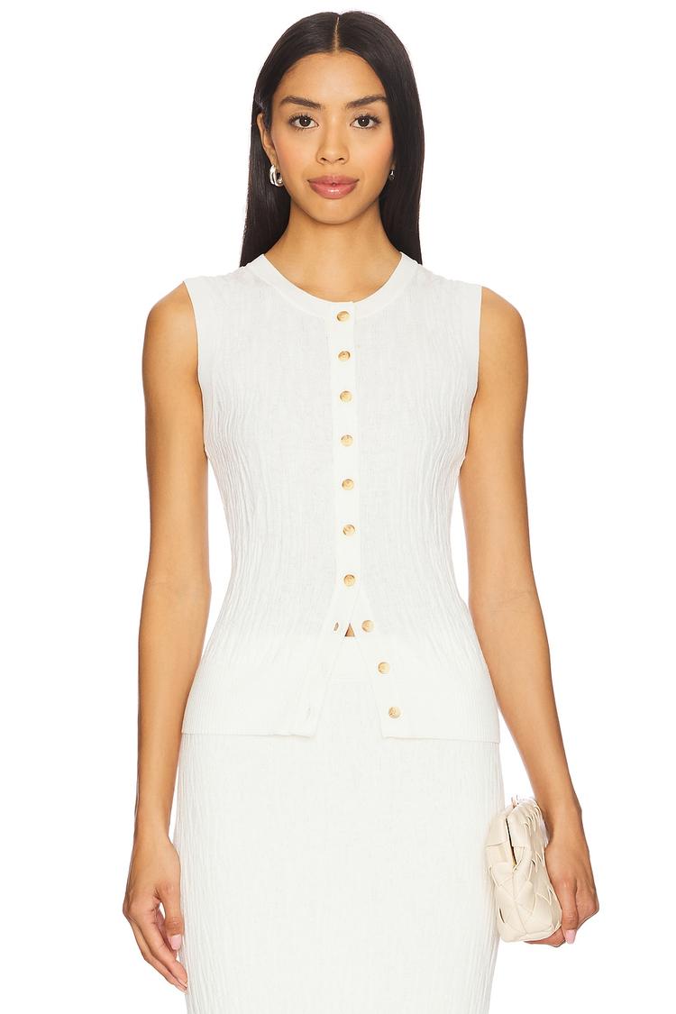 Soft viscose and nylon blend fabric shapes this fitted sleeveless shell top in a pristine white hue. Featuring a classic round neckline and a front button closure, it offers a clean and minimalist silhouette that hits at hip length. Ideal for business casual settings, workwear, or casual brunch outings, this elegant top pairs effortlessly with skirts or tailored pants. The covered back and simple design make it a versatile staple for year-round wear, embodying timeless sophistication with understated charm.