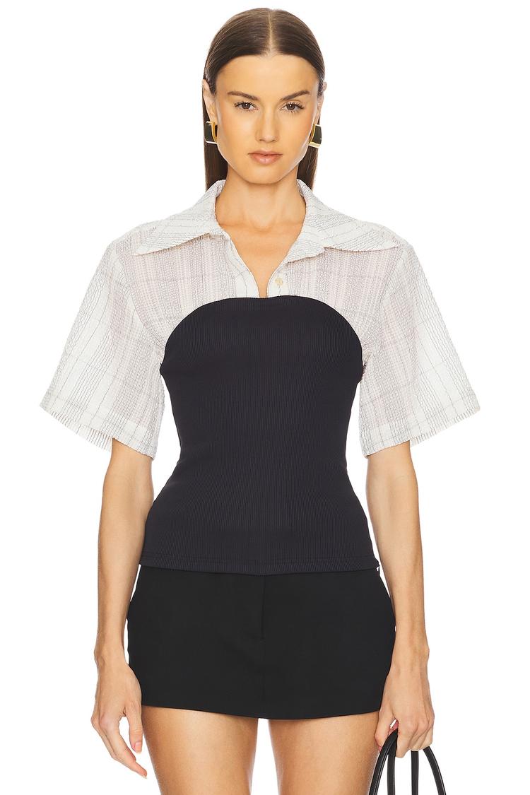 The Wren Top features a sophisticated blend of a crisp white checkered blouson upper with a sleek black fitted bodice, crafted from a midweight jacquard and ribbed jersey fabric. Its half sleeves with wide strap styling and classic collar create a polished waist-length silhouette perfect for spring, summer, and autumn. Designed with a hidden side zipper and partial front button closure, this versatile piece complements casual outings, business casual settings, and brunch dates with a modern chic appeal.