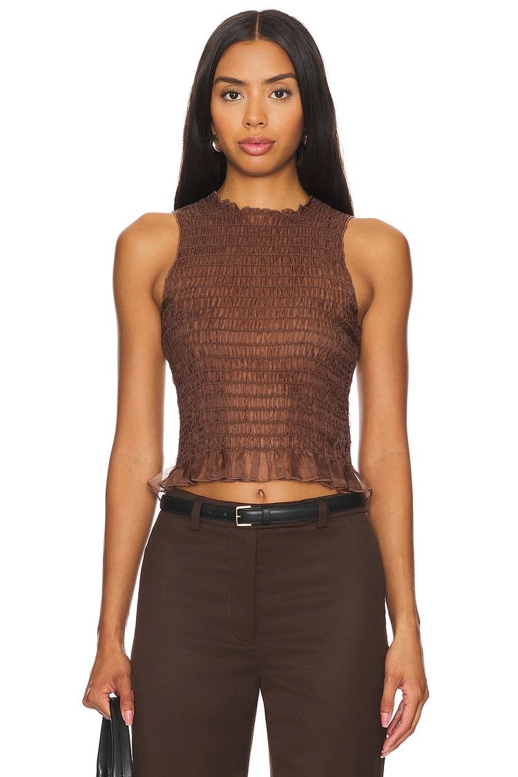 A lightweight organza silk tank with a slim fit and cropped length, this ruched top features delicate smocking all over and subtle ruffle detailing at the hem. Its sleeveless, round neckline design offers a minimalist and elegant silhouette perfect for warm spring and summer days. The sheer fabric adds a touch of sophisticated allure, making it an ideal choice for casual outings, brunch dates, or night outs. Pullover styling ensures easy wear while the matte brown hue complements versatile styling options.