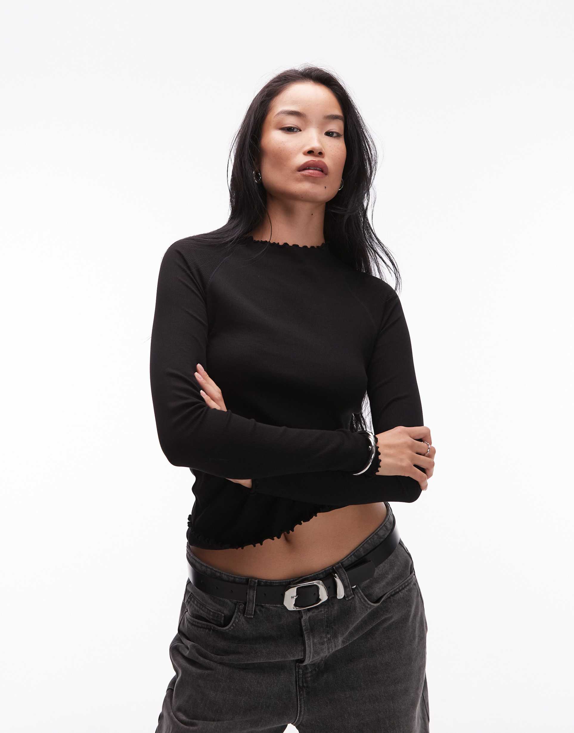 Soft and stretchy ribbed jersey fabric creates a sleek silhouette in this slim fit top featuring a high neck and long sleeves with raglan styling. The waist length hem is adorned with delicate crinkle ruffles for a subtle feminine touch, perfect for casual, everyday, and workwear looks. Its minimalist black hue and classic design make it a versatile layering piece for all seasons, pairing effortlessly with jeans or skirts for a refined yet relaxed vibe.