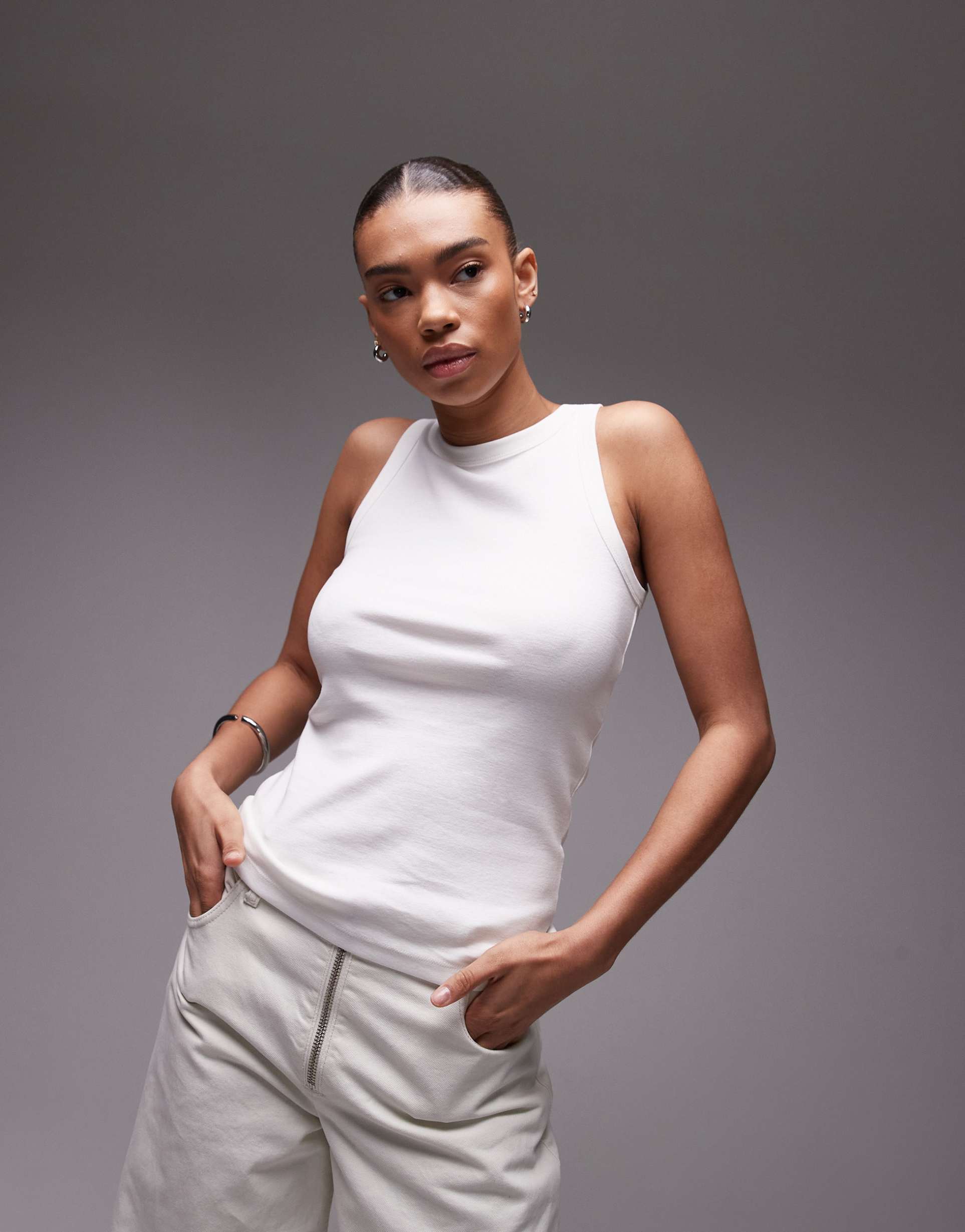 Soft, ribbed cotton jersey shapes this minimalist tank top with a classic crew neck and racerback design. Its regular fit and hip length offer comfortable everyday wear, while the wide straps and sleeveless cut keep it breezy for spring and summer. Ideal for casual outings, workwear layering, or travel, this white tank blends versatility with understated style, making it a timeless essential in any wardrobe.