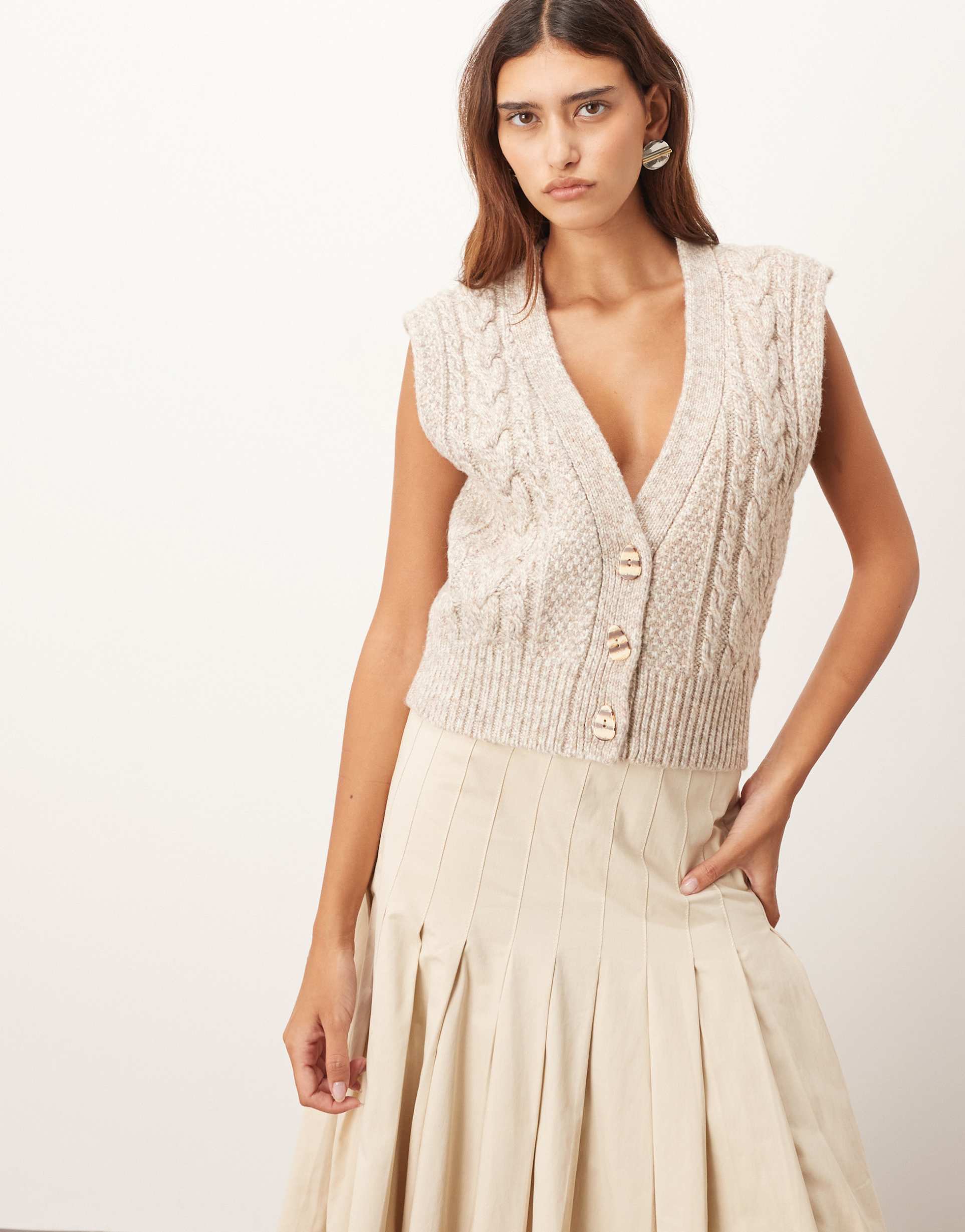 Soft beige cable knit layered in a twisted yarn adds cozy texture to this sleeveless tank cardi. Designed with a classic V-neck and button front closure, its regular fit and hip length make it a versatile layering piece for autumn, winter, and spring. The knitted fabric offers warmth and style, perfect for casual outings, brunches, or everyday wear. Pair this timeless knit with skirts or jeans to achieve an effortlessly chic and comfortable look.