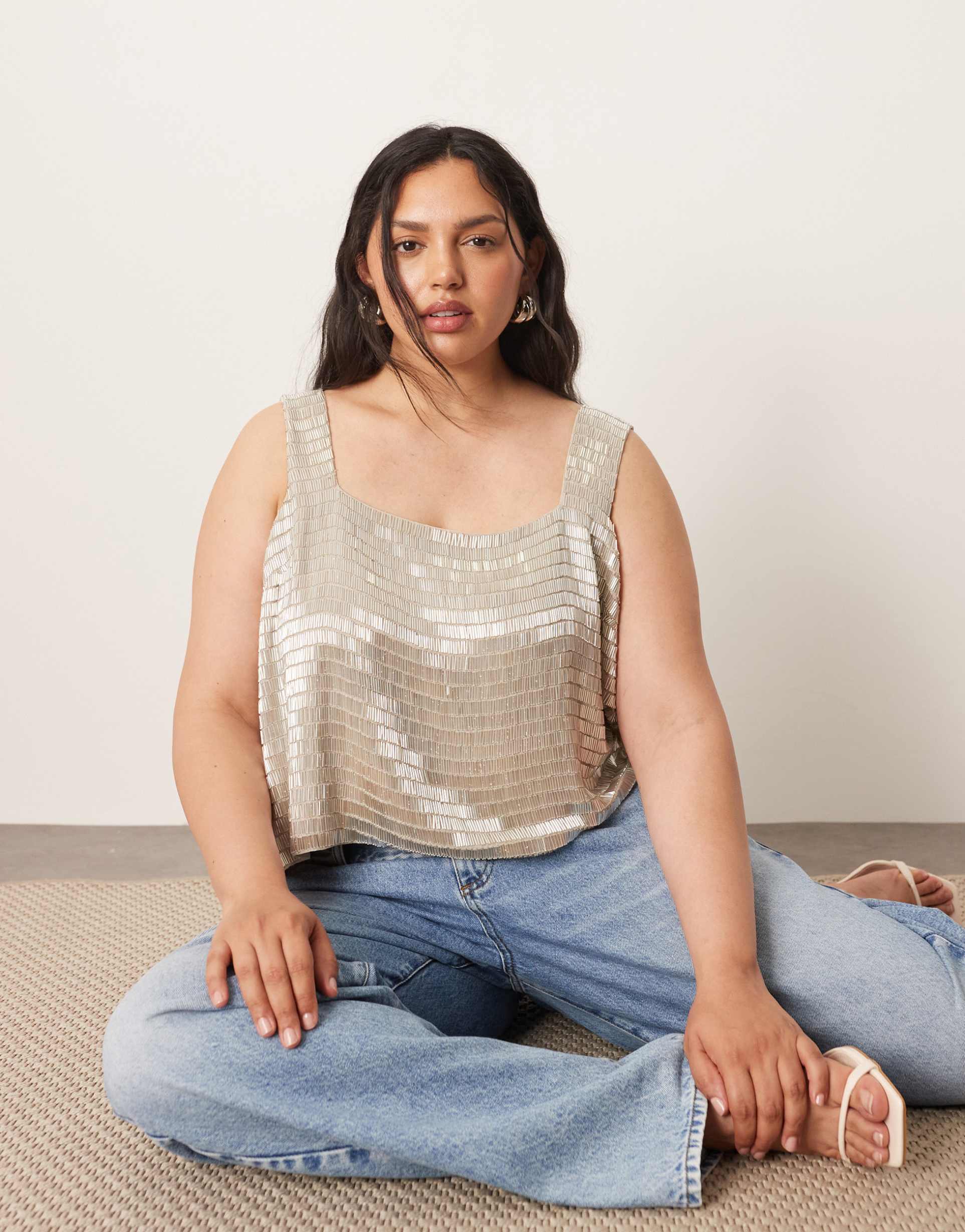 ARRANGE CURVE EMBELLISHED BEADED SQUARE NECK BOXY CROP TOP IN SILVER